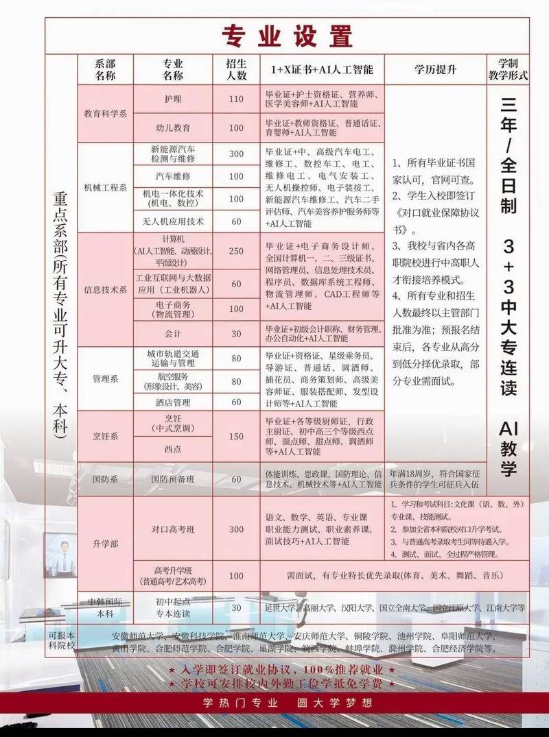 新能源汽车检测取维修:学制3年,现场征询并填写报名表格,各专业名额无限,采用园林式规划,应届/往届初中结业生:春秋14-18周岁(2026年9月1日前满14周岁)。焦点课程包罗计较机拆卸、收集手艺、消息平安根本。非安徽省户籍考生:无需额外供给社保或栖身证明,无不良嗜好及传染性疾病,更沉视学生的进修志愿取职业潜力。实现职业胡想的起点!